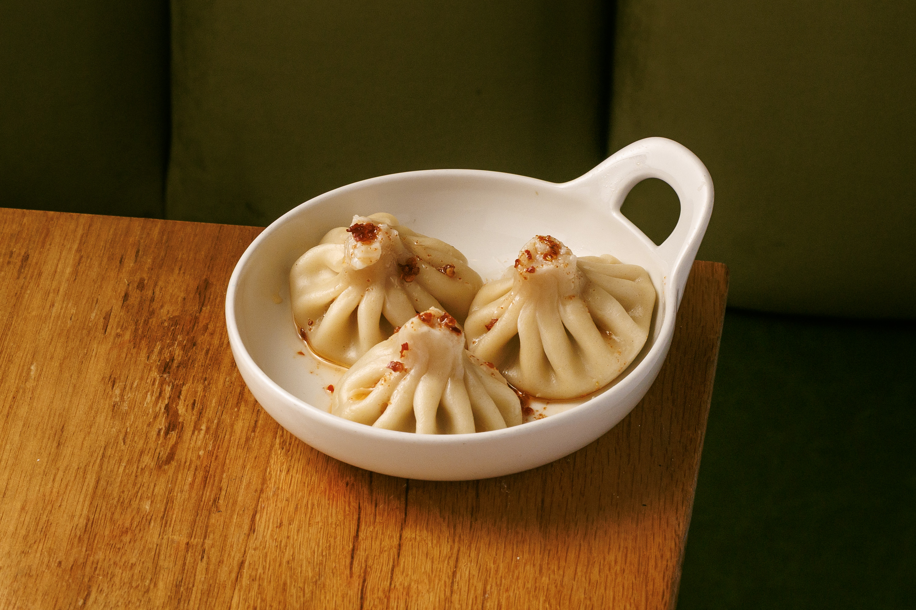 Our hand-folded Thanksgiving Khinali with minced turkey seasoned with black pepper, cumin red chili, onion, garlic. Served with Ajika