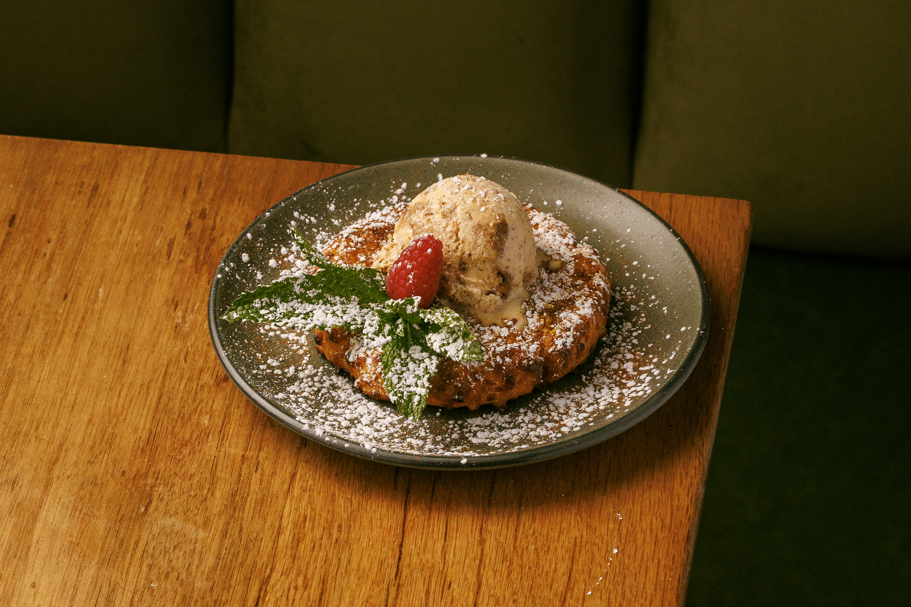 Svanetian-style pumpkin corn bread with melted sulguni cheese. Topped with house-made honey cake ice cream